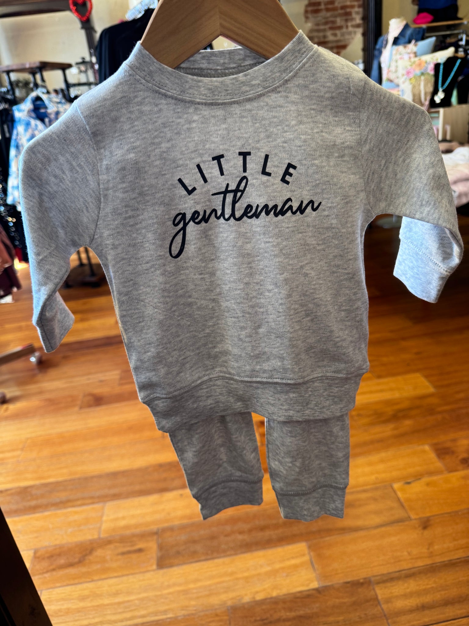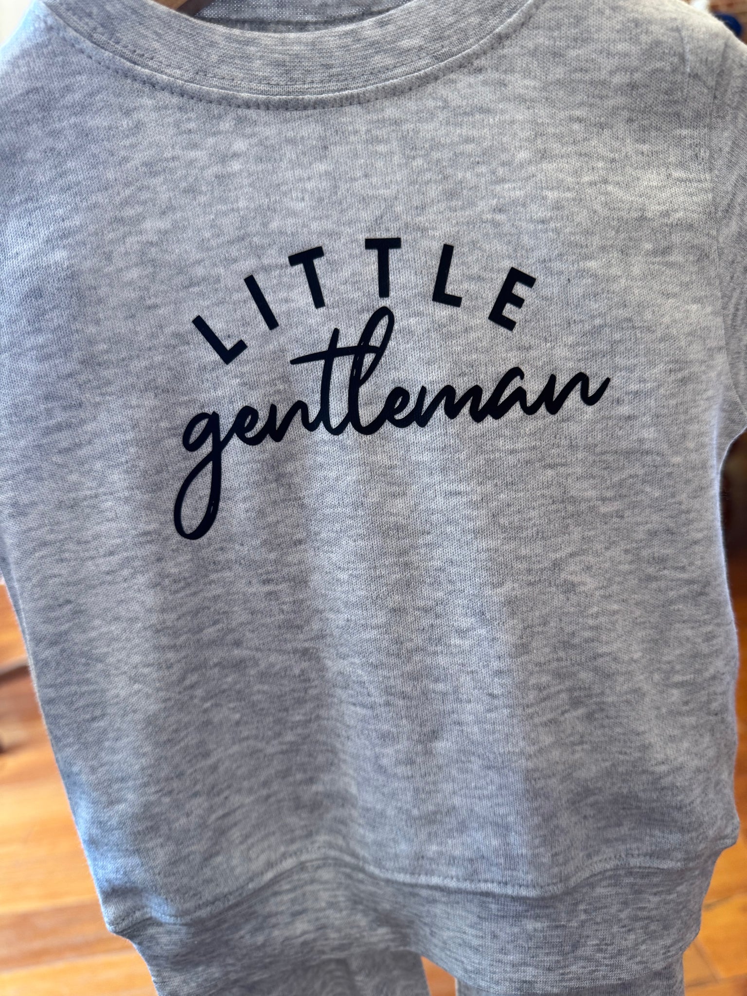Little Gentleman printed on a gray laughing giraffe jogger set.