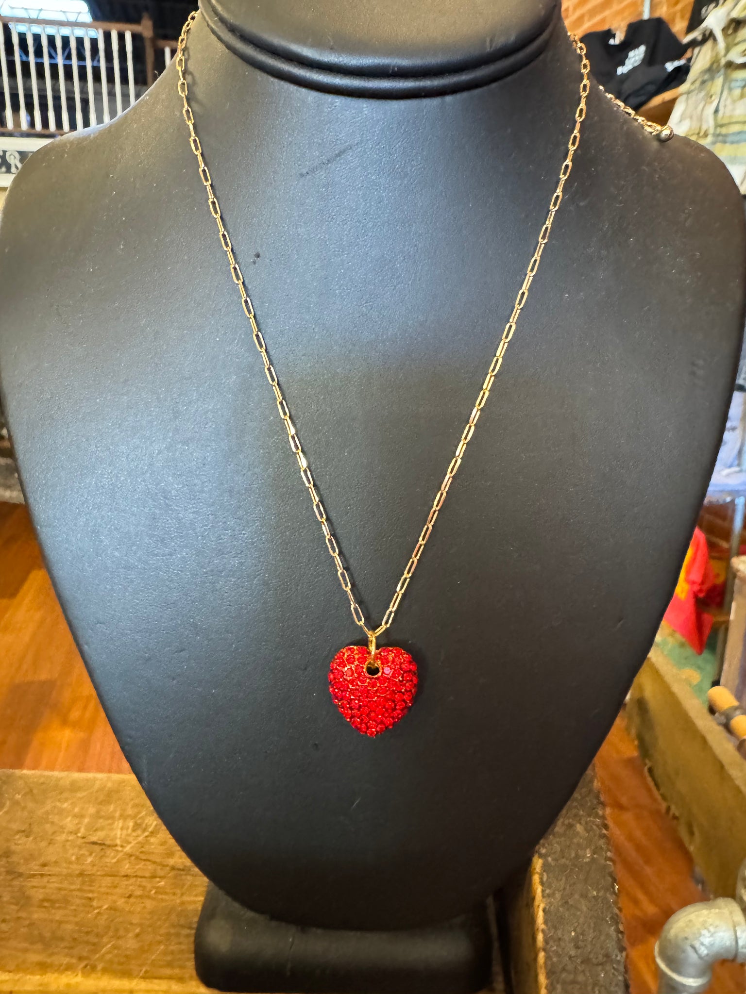 Red Rhinestone Heart Pendant on gold link chain necklace.